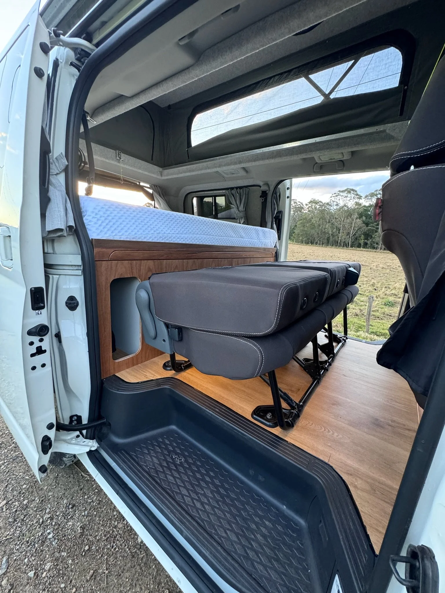 This was a unique weekend set up designed to sleep a family of four. It needed to be easy to set up, giving an outside cooking area and plenty of storage whilst maintaining a seating area with the rear passenger chairs.