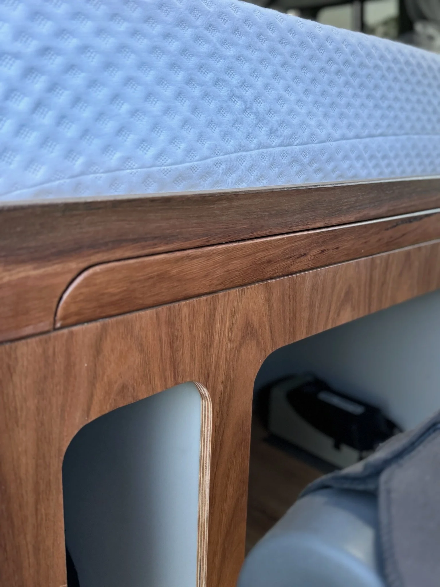 Spotted Gum lightweight ply veneered for exposed drawer faces. Hardwood Spotted Gum trims border bed ends. The Hardwood strengthens the bed slide out which creates the secondary bed for this clients children.